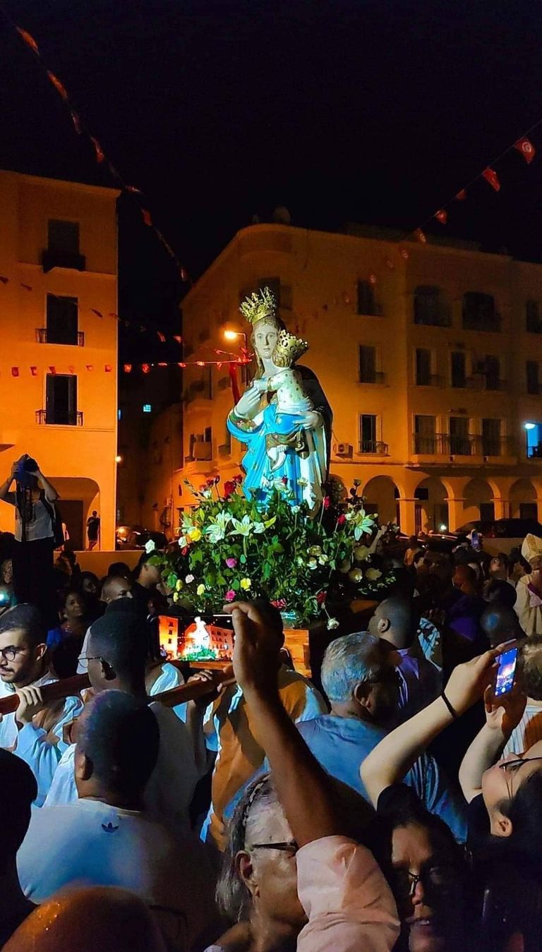 خرج، مساء أمس الإثنين، موكب "مادونا سيدتي" أو السيدة العذراء بمدينة حلق الوادي بالضاحية الشمالية للعاصمة تونس، في مشهد يدل على التعايش السلمي بين الأديان.
