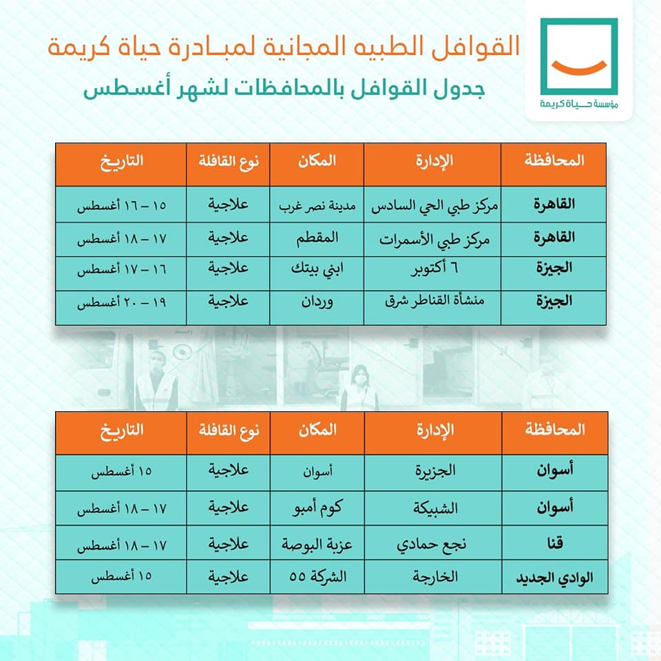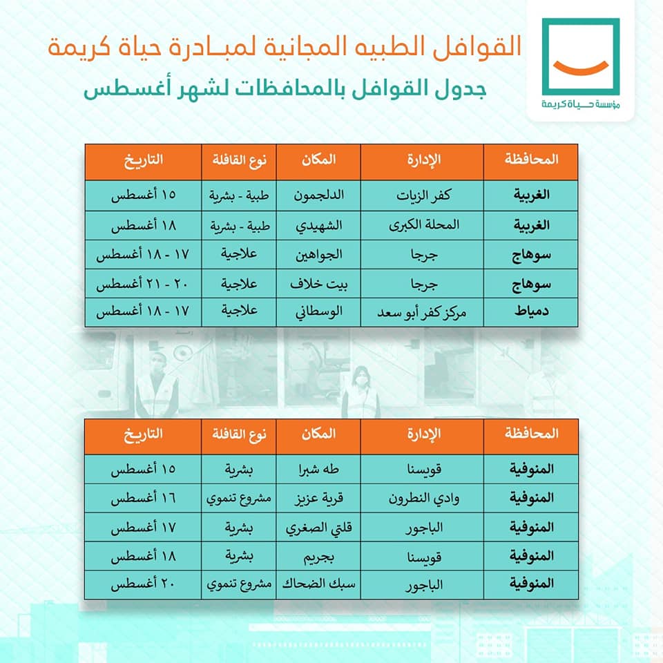 - ترصد الصور مواعيد القوافل الطبية لمبادرة حياة كريمة بمحافظات الجمهورية لشهر أغسطس.