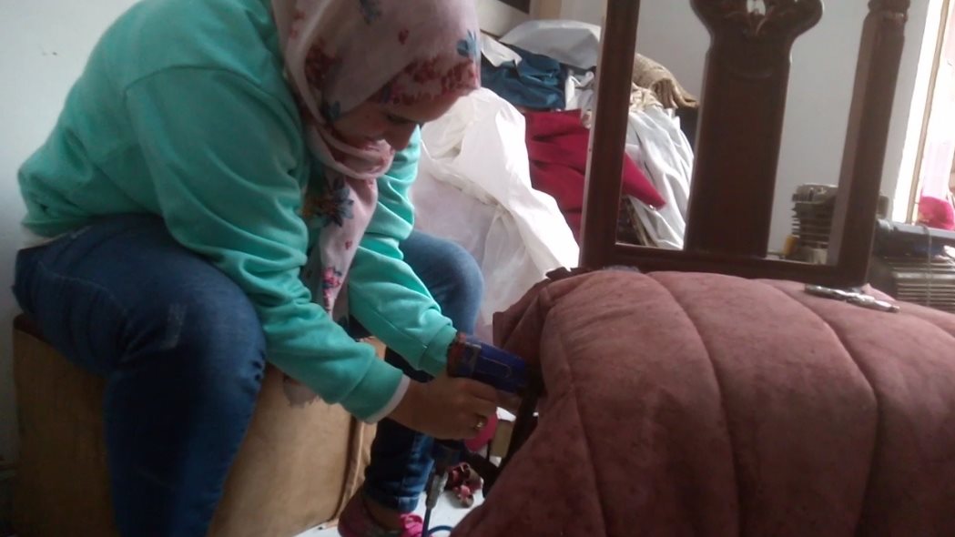 إيدها تتلف في حرير.. أميرة سالم تتحدى الرجال بالبحيرة وتبدع في مهنة التنجيد l فيديو