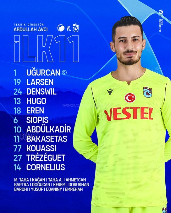 أعلن عبد الله أفجي المدير الفني لفريق طرابزون سبور بطل الدوري التركي عن تشكيل فريقه لمواجهة مضيفه كوبنهاجن الدنماركي، مساء اليوم الثلاثاء، على ملعب باركن ستاديون في الدنمارك، في ذهاب الدور المؤهل لمرحلة المجموعات في دوري أبطال أوروبا.
