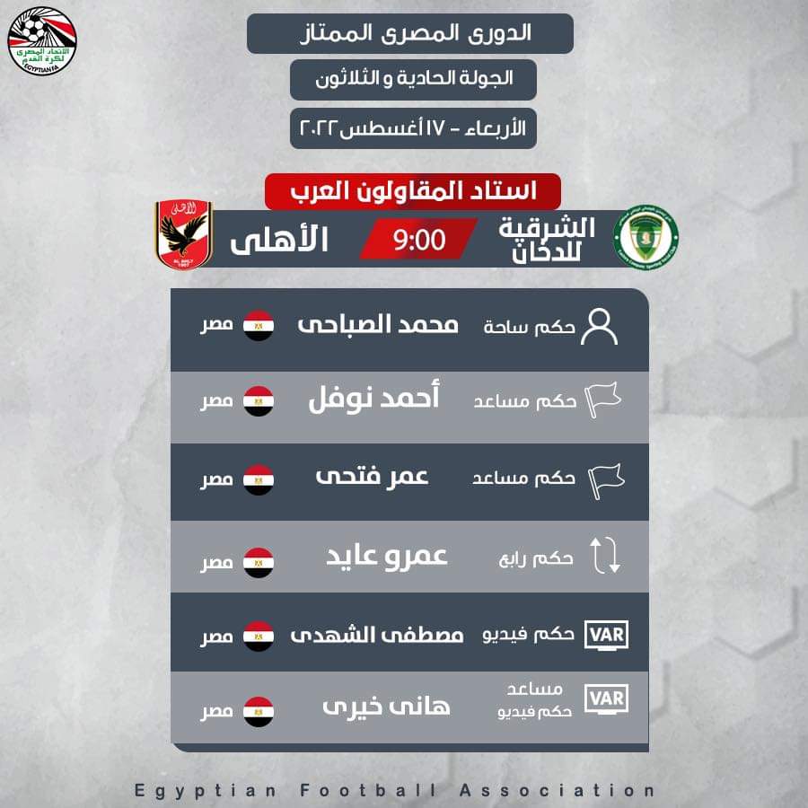 ويدير لقاء الأهلي وايسترن كومباني بالدوري الممتاز كلا من: محمد الصباحي حكم ساحة، أحمد نوفل حكم مساعد أول وعمر فتحي حكم مساعد ثاني، عمرو فايد حكم رابع، مصطفى الشهدي حكم فيديو، هاني خيري مساعد حكم فيديو