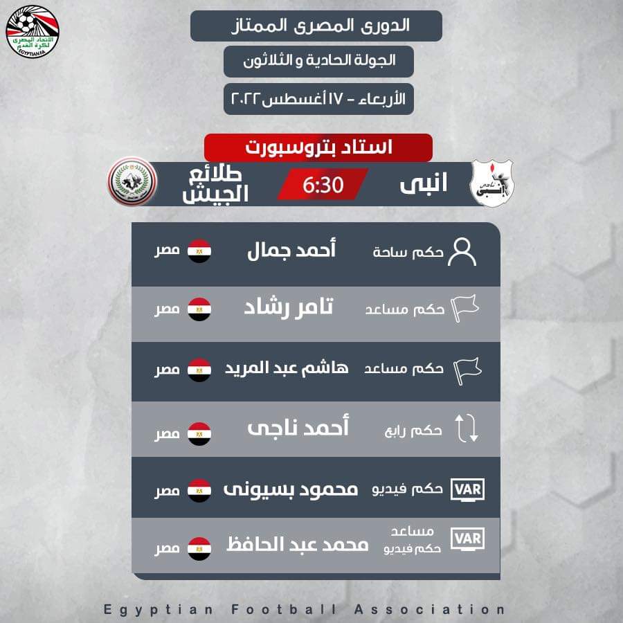 ويدير لقاء انبي وطلائع الجيش كلا من: أحمد جمال حكم ساحة، تامر رشاد حكم مساعد أول، هشام عبدالمريد حكم مساعد ثاني، أحمد ناجي حكم رابع، محمود بسيوني حكم فيديو، محمد عبد الحافظ مساعد حكم فيديو.