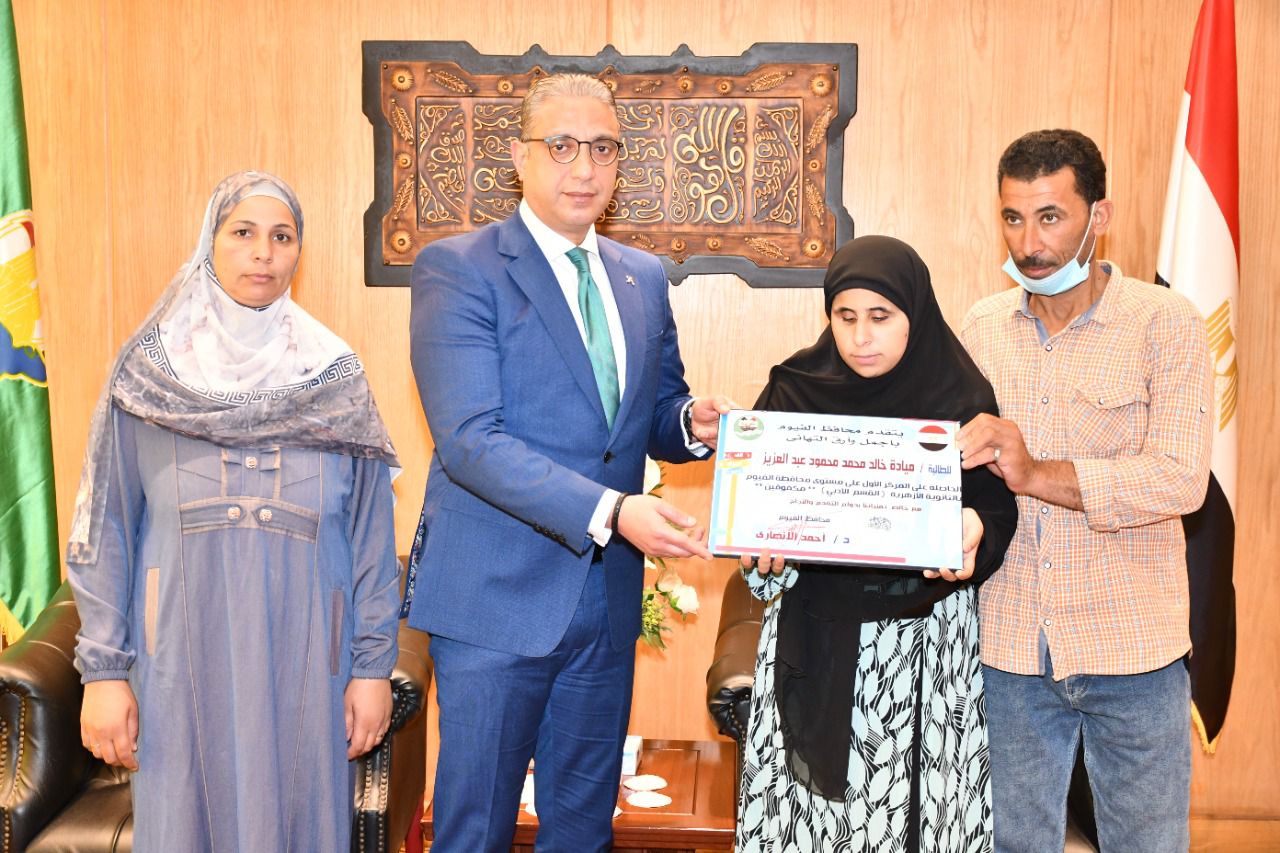 أهدى الدكتور أحمد الأنصاري محافظ الفيوم، ميدالية تذكارية وشهادة تقدير للطالبة زينب أكرم حسن حميدة الحاصلة على المركز الأول على مستوى الجمهورية في شهادة الثانوية العامة" القسم الأدبي"، والطالبة ميادة خالد محمد محمود الحاصلة على المركز الأول على مستوى المحافظة بالشهادة الثانوية الأزهرية "مكفوفين"، بحضور الدكتور محمد عماد نائب محافظ الفيوم، والدكتور محمد التوني معاون المحافظ، ومديرية التربية والتعليم محافظة الفيوم.