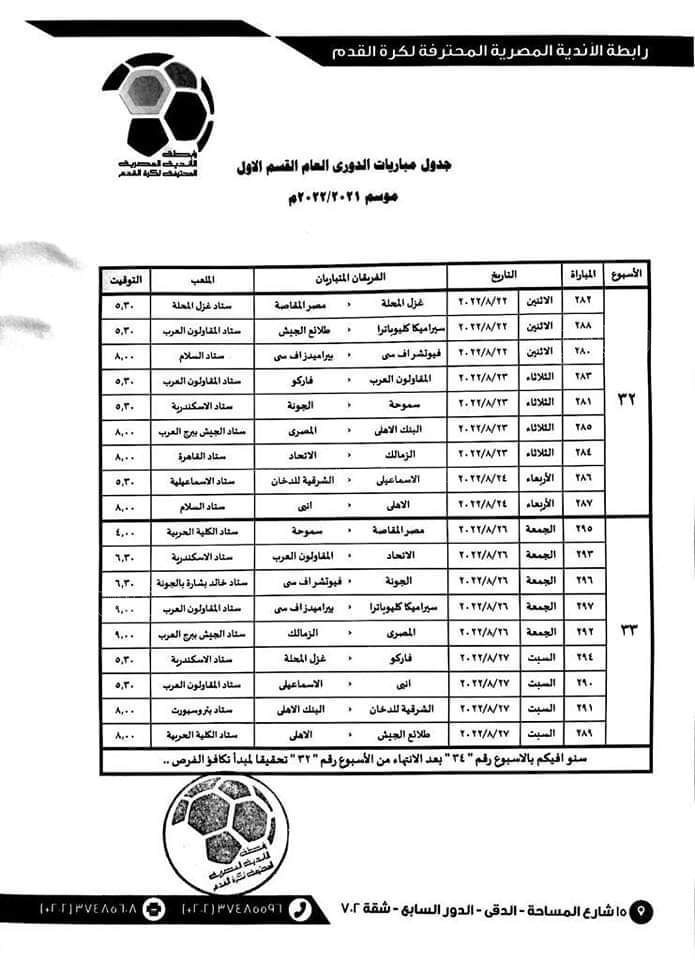 أعلنت رابطة الأندية المحترفة برئاسة أحمد دياب مباريات الجولة ٣٢ و٣٣ بالدوري الممتاز، على أن يتم إعلان مباريات الجولة ٣٤ والأخيرة من عمر مسابقة الدوري عقب انتهاء الجولة ٣٢، تحقيقًا لمبدأ تكافؤ الفرص.