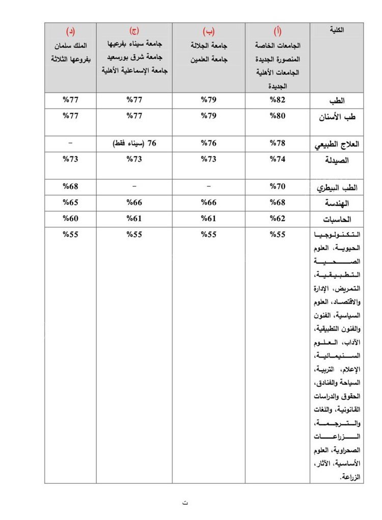 جاء الحد الأدنى للقبول بكليات الطب البشري وطب الأسنان ٧٧٪، بينما كان الحد الادنى للقبول بكلية الطب البيطري ٦٨٪ والصيدلة ٧٣٪، بينما كان الحد الادنى للقبول بكلية الهندسة ٦٥٪ والحاسبات والمعلومات ٦٠٪، وباقي الكليات ٥٥٪.