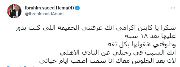 وكتب إبراهيم سعيد تغريدة على تويتر "شكرا يا كابتن اكرامي انك عرفتني الحقيقة اللي كنت بدور عليها بعد ١٨ سنة ودلوقتي هقولها بكل ثقة إنك السبب في رحيلي عن النادي الأهلي لأن بعد الجلوس معاك أنا شفت أصعب أيام حياتي"
