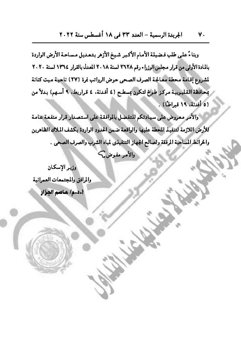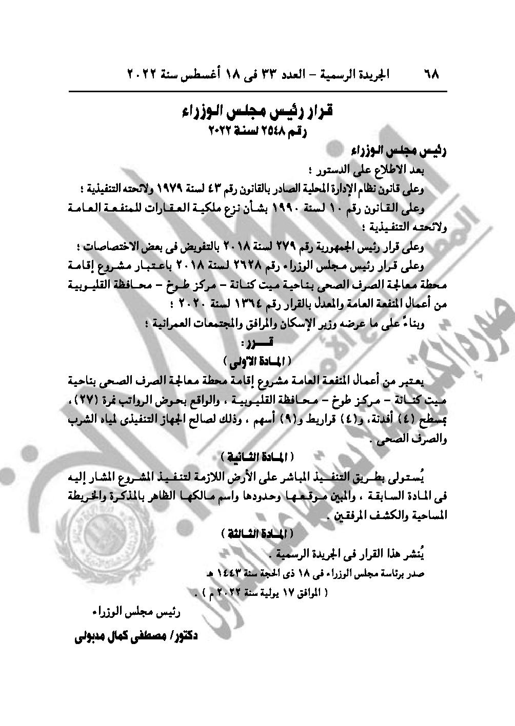 القرار رقم 254 لسنة 2022، بشأن اعتبار مشروع إقامة محطة معالجة الصرف الصحي بناحية ميت كنانة- مركز طوخ- محافظة القليوبية، والواقع بحوض الرواتب نمرة (27)، بمسطح (4) أفدنة و4 قراريط ز9 أسهم، من أعمال المنفعة العامة، وذلك لصالح الجهاز التنفيذي لمياه الشرب والصرف الصحى.