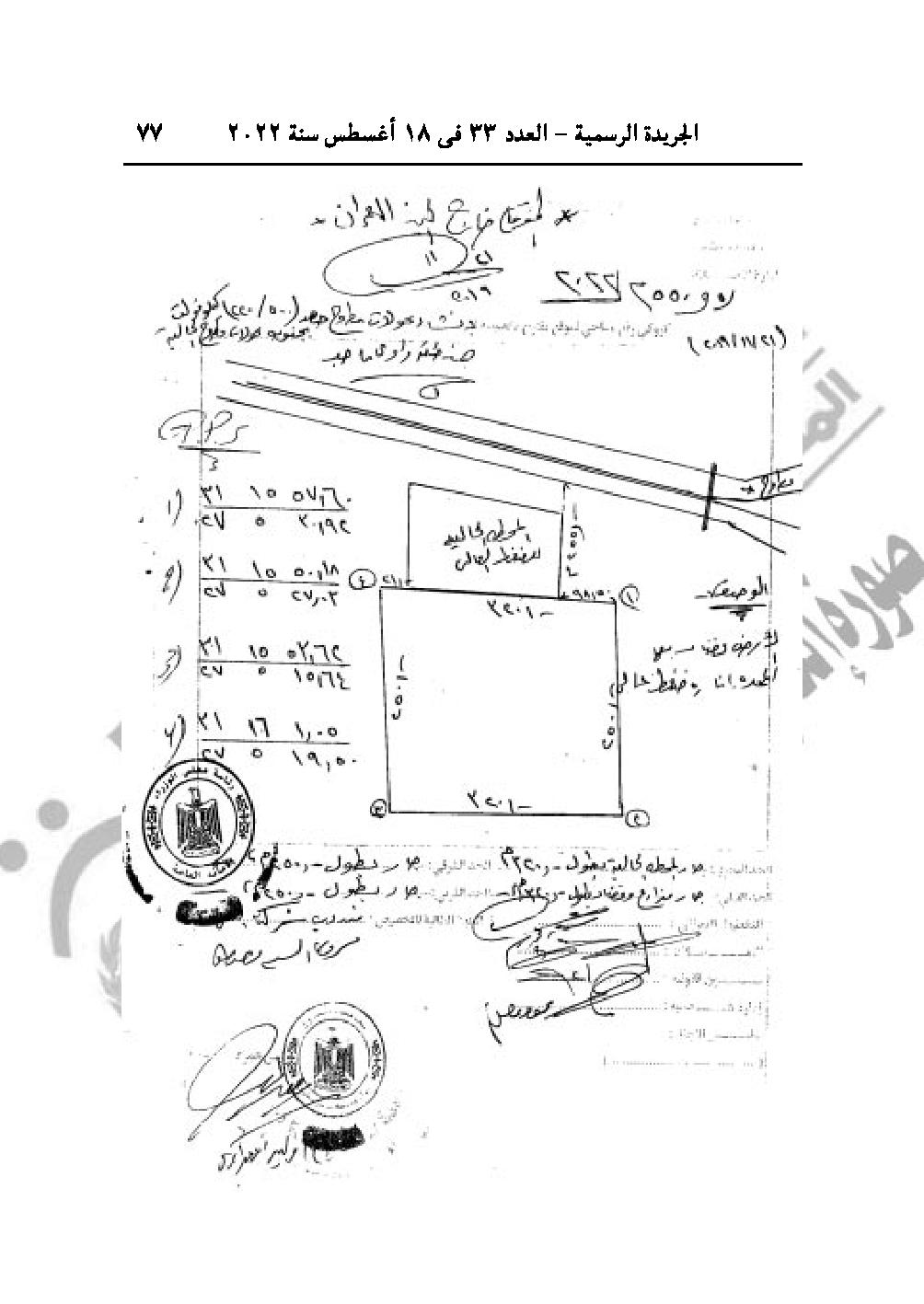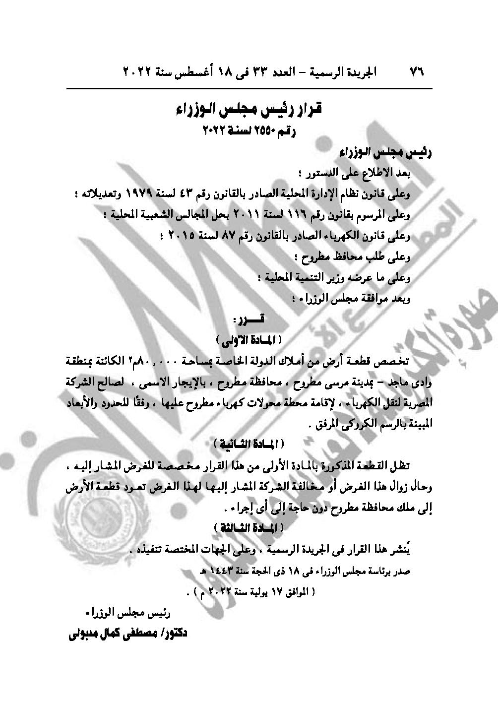 والقرار رقم 2550 لسنة 2022، بشأن تخصيص قطعة أرض من أملاك الدولة الخاصة بمساحة 80 ألف متر مربع، والكائنة بمنطقة وادي ماجد بمدينة مرسى ممطروح، بمحافظة مطروح وبالإيجار الاسمي، لصالح الشركة المصرية لنقل الكهرباء، لإقامة محولات كهرباء مطروح عليها، وفقًا للحدود والأبعاد المبنية بالرسم الكروكي.