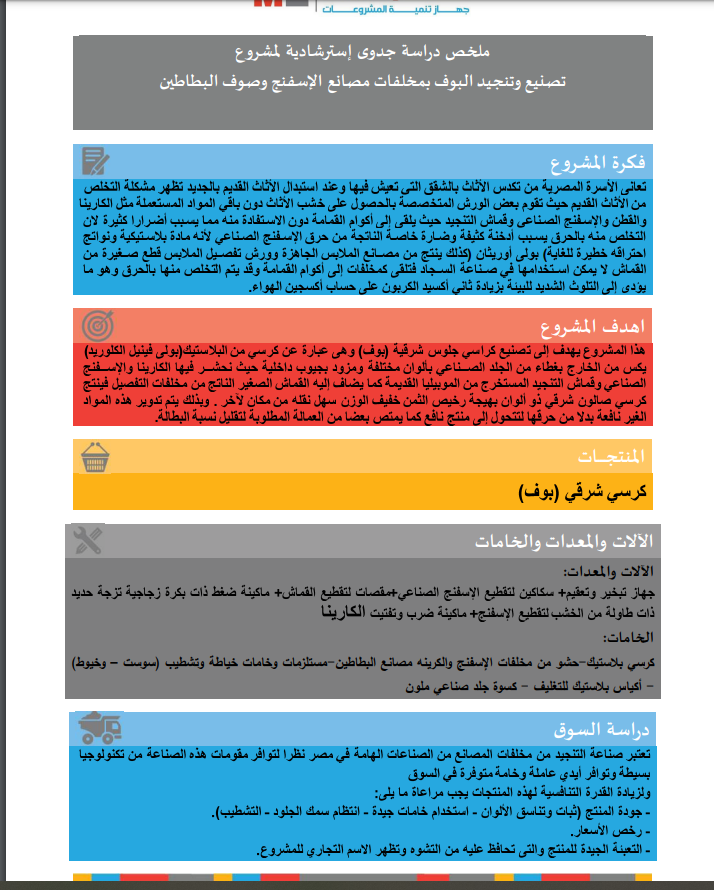 وتستعرض "فيتو" كافة التفاصيل المتعلقة بدراسة جدوى استرشادية "مشروع تصنيع وتنجيد البوف بمخلفات مصانع الأسفنج وصوف البطاطين" والتي أعدها جهاز تنمية المشروعات الصغيرة والمتوسطة خلال السطور التالية: