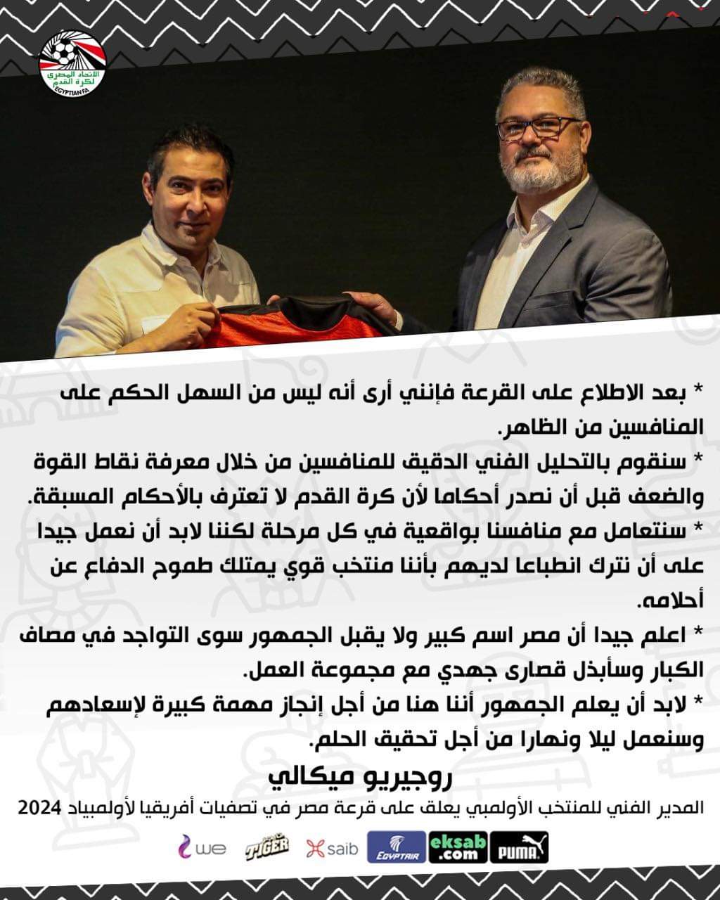 و اختتم ميكالي حديثه: منتخب مصر اسم كبير ولا يقبل الجمهور سوى التواجد في مصاف الكبار وسأبذل قصارى جهدي مع مجموعة العمل وتابع: نحن هنا من أجل انجاز مهمة كبيرة لاسعادهم