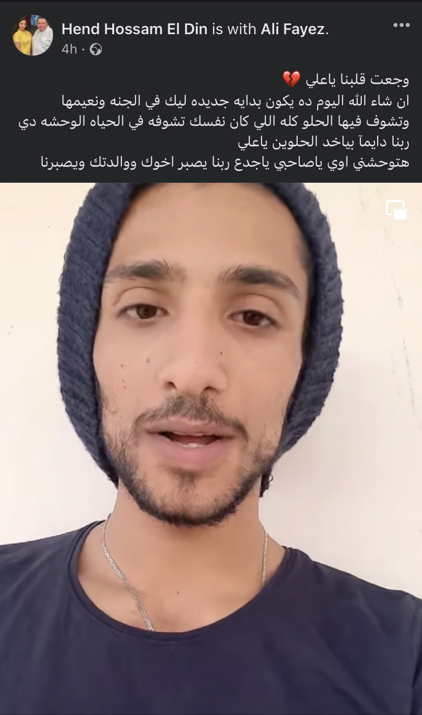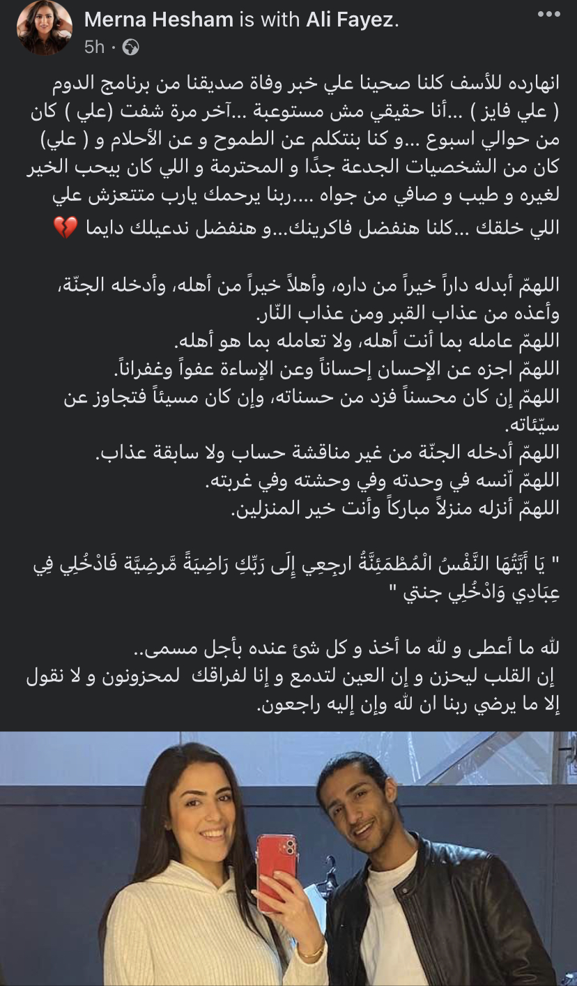 توفي اليوم الفنان الشاب علي فايز أحد المشاركين في برنامج "الدوم" لاكتشاف المواهب، ليتحول حسابه على موقع التواصل الاجتماعي "فيس بوك" لدفتر عزاء ويضج برسائل النعي والرثاء الحزينة من أصدقائه ومحبيه وزملائه.