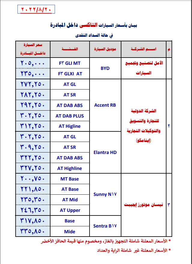 قائمة أسعار التاكسى داخل مبادرة إحلال السيارات ابتداء من الغد