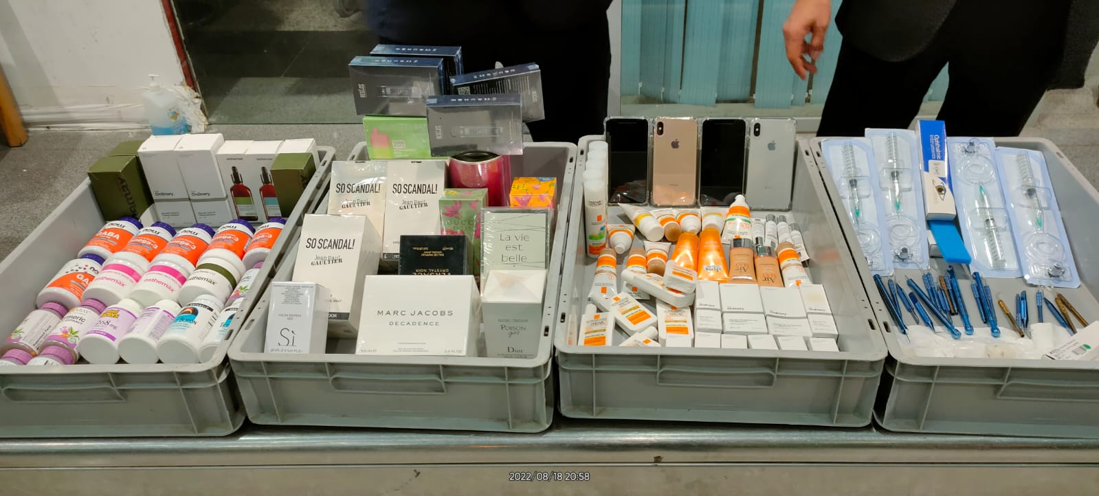 وبالعرض علي وليد عيسي مدير إدارة الجمرك قام بتشكيل لجنة لتفتيش حقائب الراكب وتفتيشه ذاتيا من محمود غنيم مأمور حركة وحازم عطا الله مأمور الأمن الجمركي وهلال الغزالي رئيس قسم مكافحة التهرب الجمركى وكريم صبحي رئيس الوردية فتبين وجود ١٥ عبوة مكملات غذائية و٣٣ عبوة أدوات ومستلزمات طبية لجراحة العيون و٦ عبوات سجائر وشيش إلكترونية و١٢ زجاجة عطور و٥٠ علبة مستحضرات تجميل بين طيات الملابس و٤ هواتف محمولة ماركة iphone xs max بدون علب أو لوازم مخبأة على جسد الراكب.