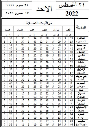 مواقيت الصلاة اليوم وفقًا للتوقيت المحلي لمدينتي القاهرة والإسكندرية وعدد من مدن ومحافظات الجمهورية من واقع بيانات الهيئة العامة للمساحة: