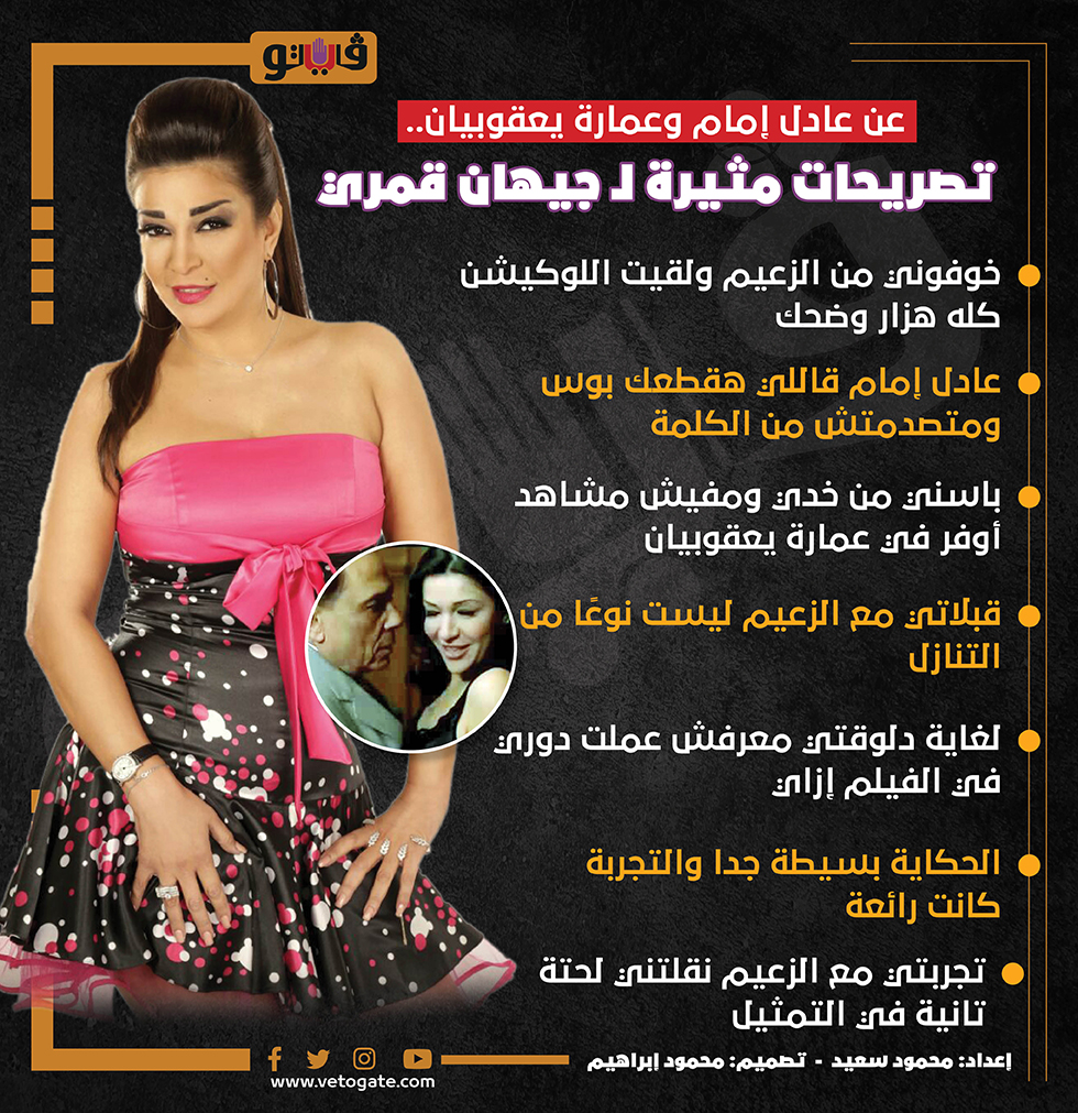 عن عادل إمام وعمارة يعقوبيان.. تصريحات مثيرة لـ جيهان قمري|انفو جراف السبت 20/أغسطس/2022 - 02:00 م 8/20/2022 2:00:13 PM جيهان قمري محمود سعيد شارك طباعة 18 حجم الخط شارك طباعة جيهان قمري عمارة يعقوبيان عادل امام الفنانة جيهان قمري الفنان عادل إمام الزعيم