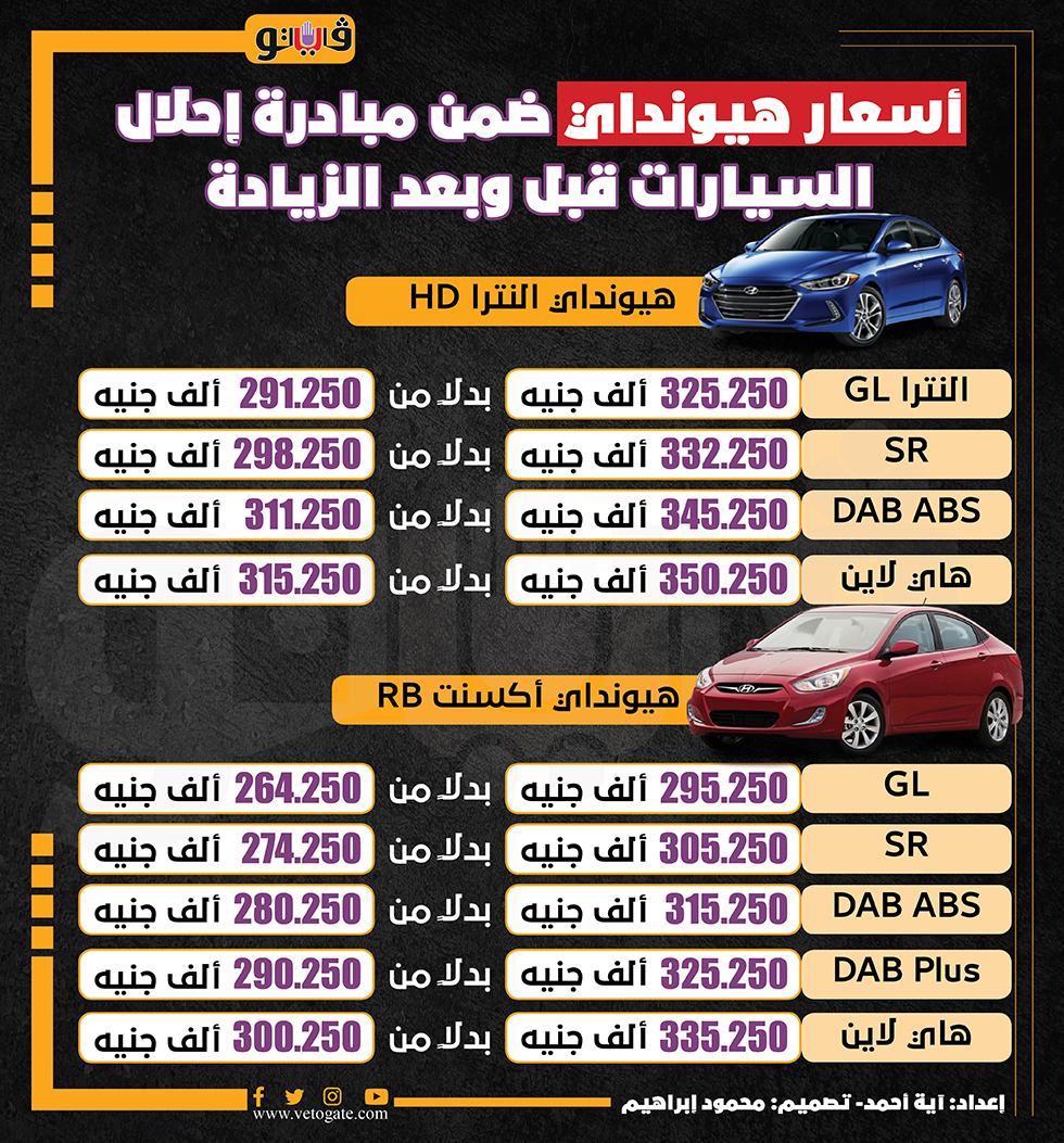 أسعار هيونداي ضمن مبادرة إحلال السيارات قبل وبعد الزيادة | إنفوجراف السبت 20/أغسطس/2022 - 05:57 م 8/20/2022 5:57:34 PM أسعار هيونداي آية أحمد شارك طباعة 18 حجم الخط شارك طباعة اسعار هيونداي اكسنت RB اسعار هيونداي النترا HD اسعار هيونداي اكسنت RB