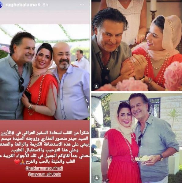 وأعلنت الخارجية العراقية، في بيان لها، عقب نشر الصور وتداولها بشكل واسع، عبر مواقع التواصل الاجتماعي، أنها "ستتخذ إجراءً بحق سفيرها في الأردن، حيدر منصور، عقب ظهوره الأخير مع زوجته، رفقة الفنان راغب علامة".