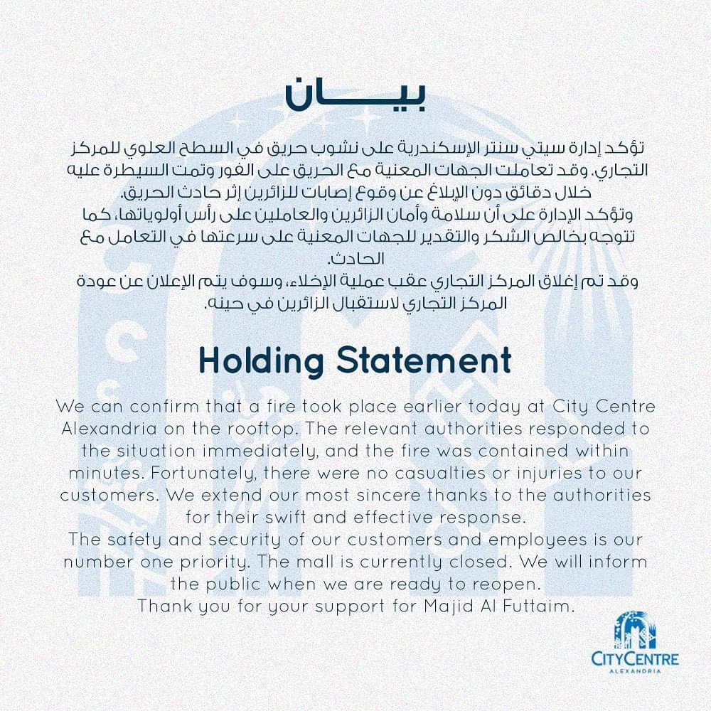 أصدرت إدارة كارفور سيتي سنتر الإسكندرية، بيانا باللغتين العربية والإنجليزية،أعلنت فيه غلق المركز التجاري كاملا في قلب المدينة بسبب نشوب حريق فيه عصر اليوم.
