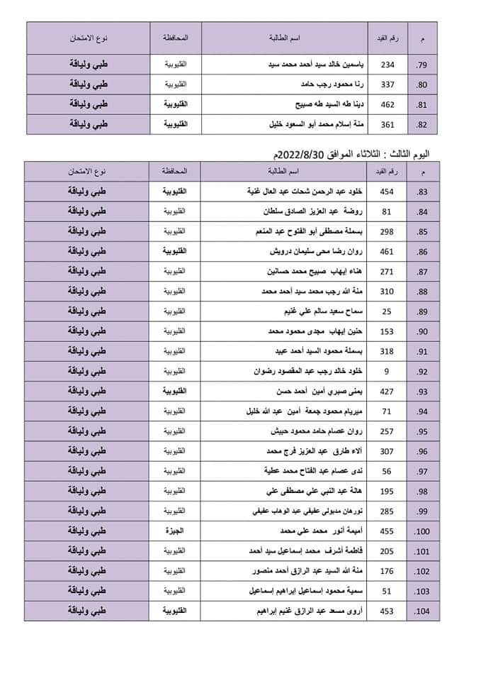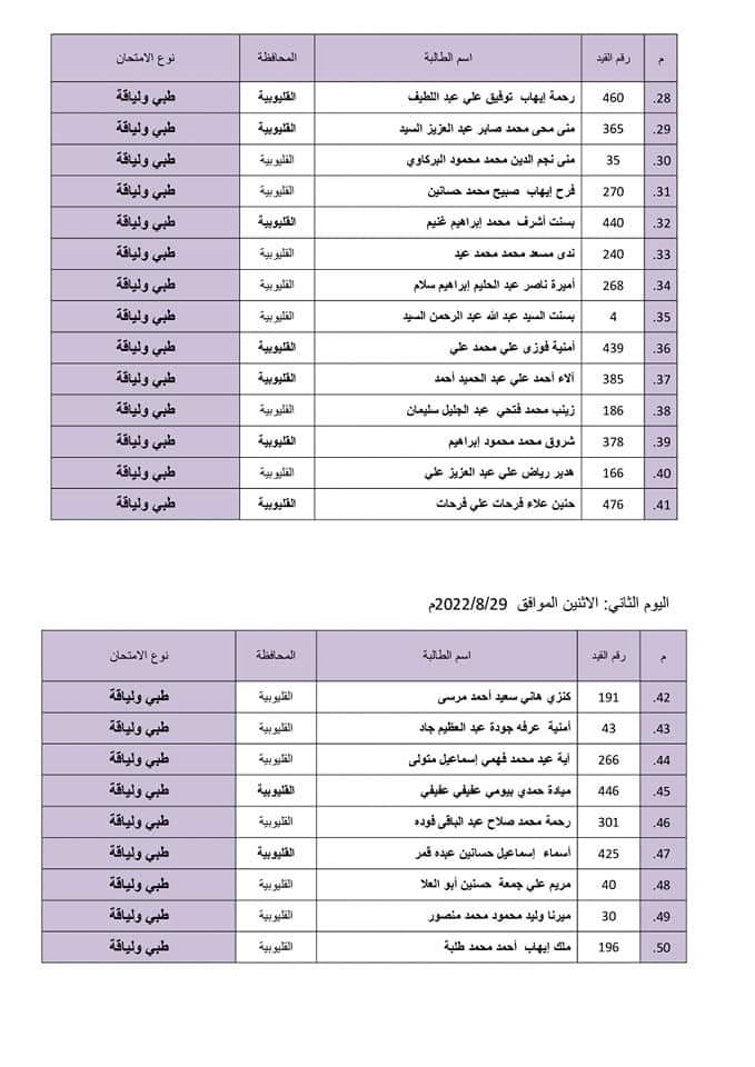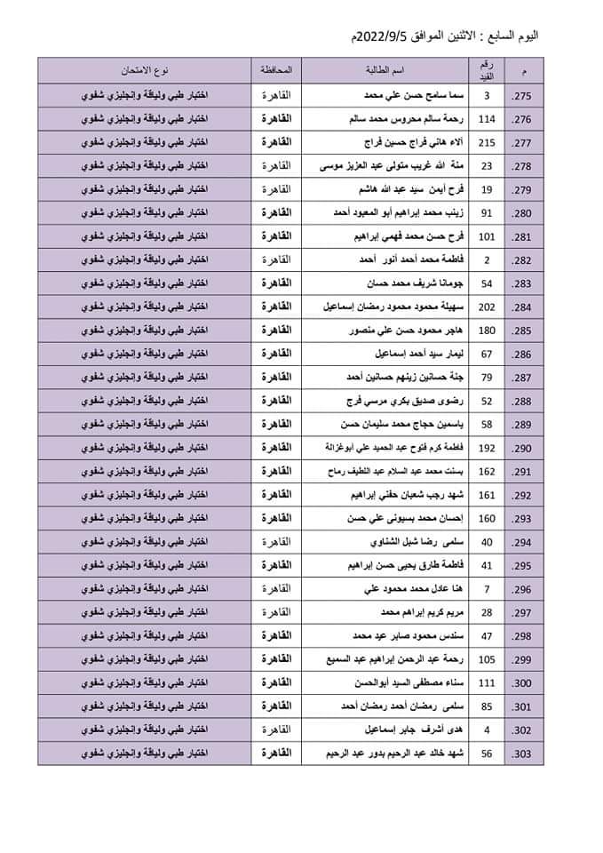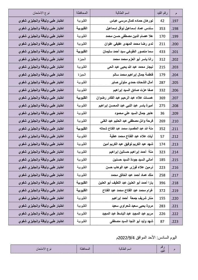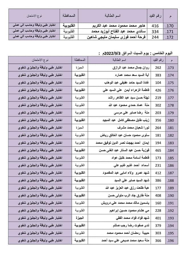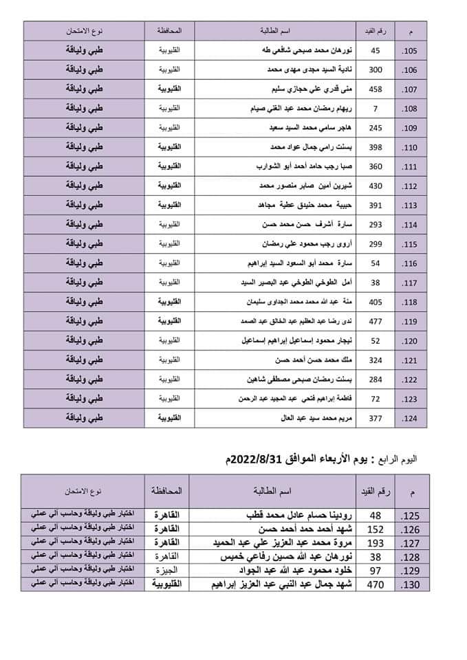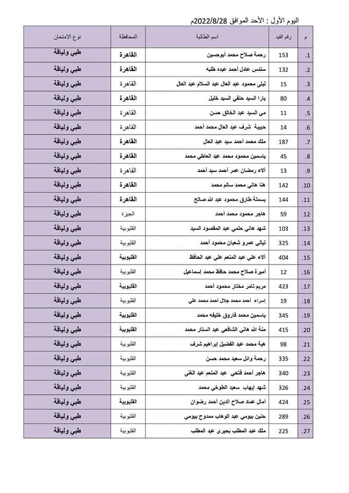 نشرت وزارة الأوقاف أسماء المرشحات للاختبارات المؤهلة للقبول بمعهد التمريض التابع لمستشفى الدعاة وزارة الأوقاف للعام الدراسي 2022-2023م من محافظات (القاهرة – القليوبية -الجيزة)، مع بيان يوم الاختبار ونوعه أمام كل متقدمة.