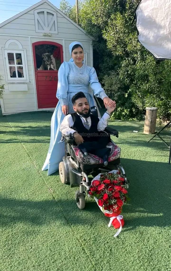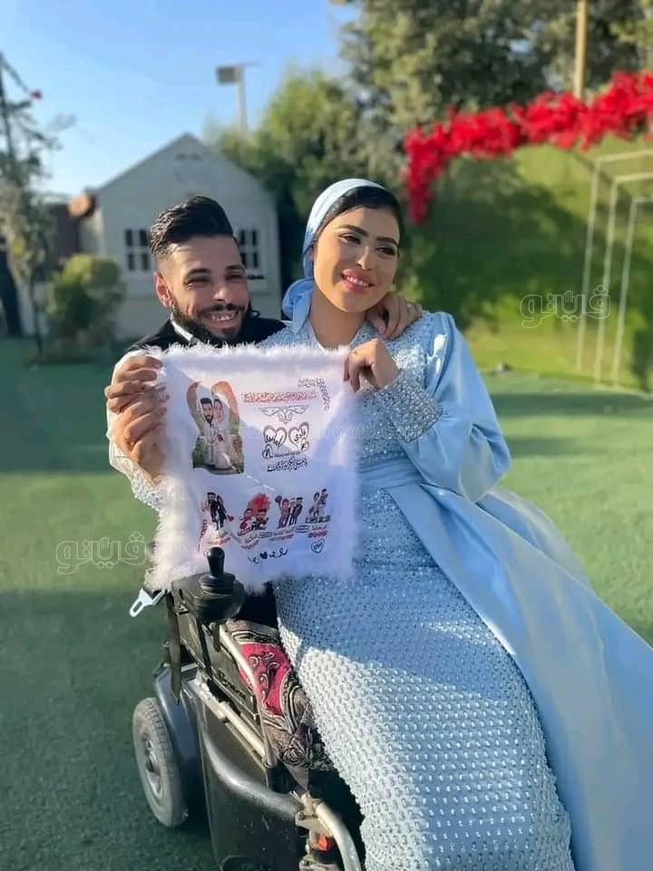 تداول رواد السوشيال ميديا صورا لجلسة تصوير العروس أماني أحمد البالغة نحو (18 عاما) تقريبا والحاصلة على دبلوم فني بنسبة نجاح تتخطى 89% علي عريسها فادي جلال سالم من ذوي الهمم والذي يكبرها بنحو 10 أعوام تقريبا ومقيمان بمنطقة كفر محمد حسين الكائنة بمدينة الزقازيق بالشرقية والحاصل علي ماجستير في اللغة العربية على كرسيه المتحرك.