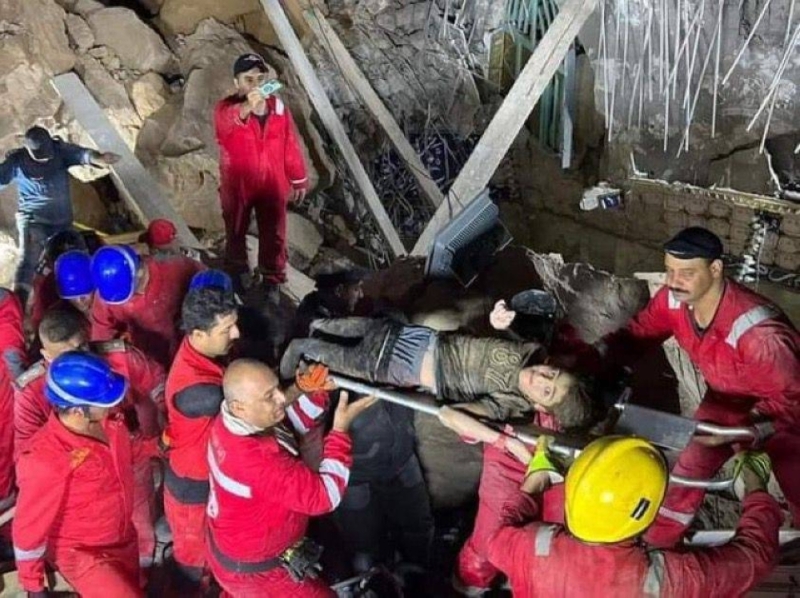وأظهرت صور عناصر الدفاع المدني وهم يخرجون طفلًا من الأنقاض محملًا على حمّالة ووجهه وجسده مغطى بالتراب.