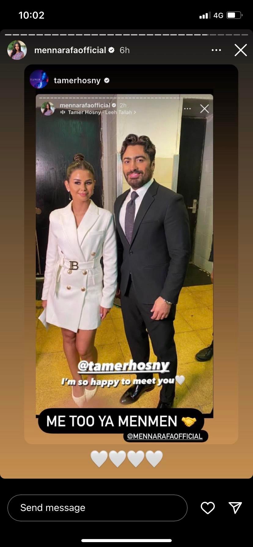 وعلقت منة عرفة على الصورة عبر خاصية الاستوري قائلة: "سعيدة جدًا بمقابلتك"، ليرد عليها تامر حسني قائلا: "وأنا كمان يا منمن".