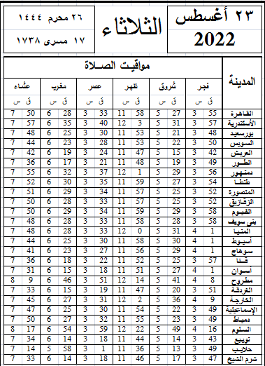 مواقيت الصلاة اليوم وفقًا للتوقيت المحلي لمدينتي القاهرة والإسكندرية وعدد من مدن ومحافظات الجمهورية من واقع بيانات الهيئة العامة للمساحة: