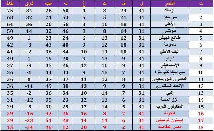 الزمالك يتصدر الترتيب برصيد 75 نقطة ويأتي خلفه بيراميدز برصيد 68 نقطة.