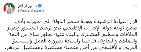 وكتب عبد الله قرقاش تغريدة على تويتر "قرار القيادة الرشيدة بعودة سفير الدولة الي طهران يأتي ضمن توجه دولة الإمارات الإقليمي نحو ترميم الجسور وتعزيز العلاقات وتعظيم المشترك والبناء عليه لخلق مناخ من الثقة والتفاهم والتعاون، قناعتنا راسخة بضرورة العمل والتنسيق العربي والإقليمي من أجل منطقة مستقرة ومستقبل مزدهر."