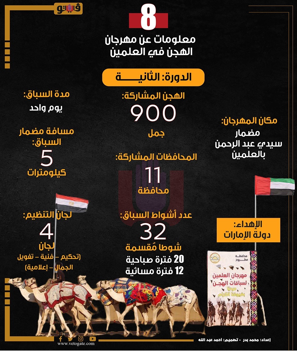 8 معلومات عن مهرجان الهجن في العلمين| انفوجراف الإثنين 22/أغسطس/2022 - 02:45 م 8/22/2022 2:45:42 PM ارشيفية محمد بدر شارك طباعة 18 حجم الخط شارك طباعة سيدي عبد الرحمن بمدينة العلمين بمحافظة مطروح محافظة مطروح مهرجان الهجن
