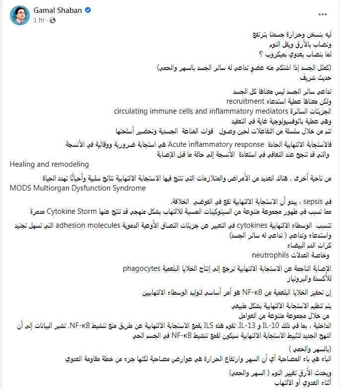 وكتب الدكتور جمال شعبان تدوينة على الفيس بوك: "ليه بنسخن وحرارة جسمنا بترتفع ونصاب بالأرق ويقل النوم لما بنصاب بعدوي بميكروب؟ (كمثل الجسد إذا اشتكي منه عضوٍ تداعي له سائر الجسد بالسهر والحمي) حديث شريف".