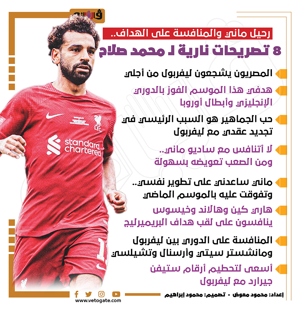 رحيل ماني والمنافسة على الهداف.. 8 تصريحات نارية لـ محمد صلاح | إنفوجراف الإثنين 22/أغسطس/2022 - 06:20 م 8/22/2022 6:20:24 PM محمد صلاح محمود معوض شارك طباعة 18 حجم الخط شارك طباعة الدوري الانجليزي البريمرليج أبطال أوروبا تصريحات محمد صلاح دوري ابطال اوروب محمد صلاح