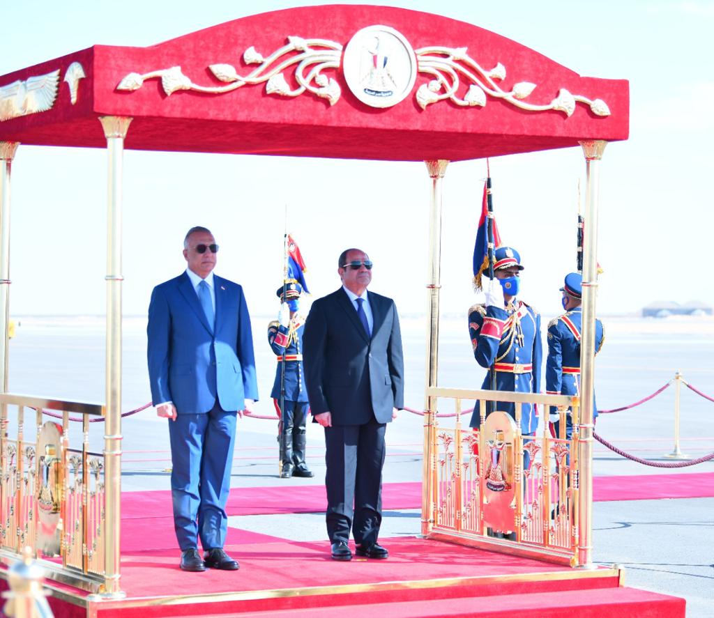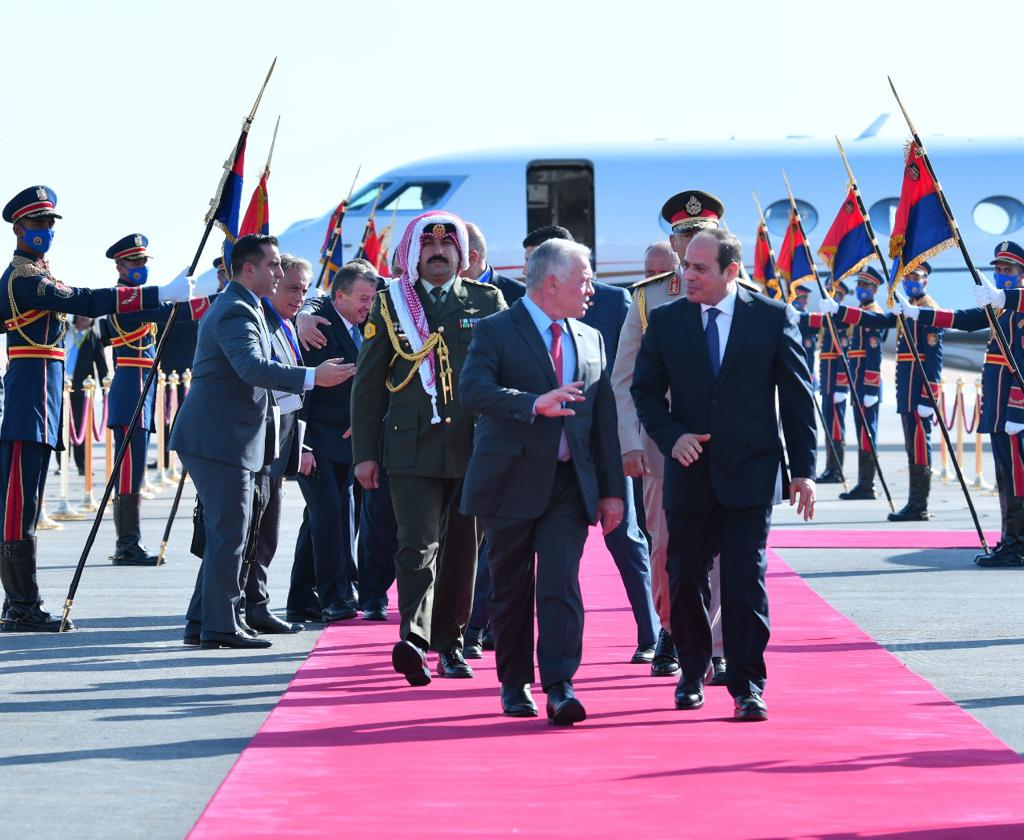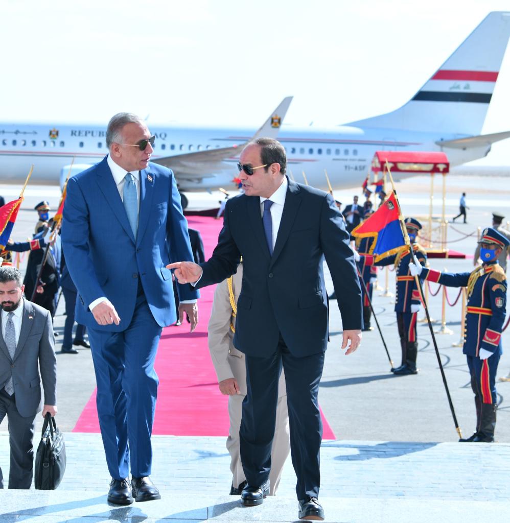 استقبل الرئيس عبد الفتاح السيسي بعد ظهر اليوم بمطار العلمين بحضور الشيخ محمد بن زايد آل نهيان رئيس الامارات كلًا من جلالة الملك عبد الله الثاني بن الحسين، ملك الأردن، وجلالة الملك حمد بن عيسى آل خليفة، ملك البحرين، ومصطفى الكاظمي، رئيس الوزراء العراقي".