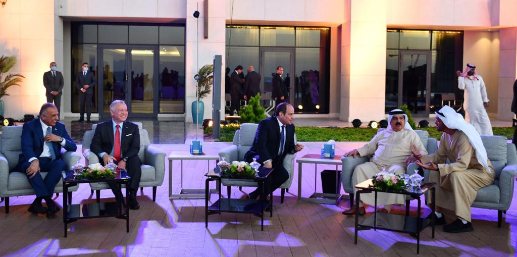 استقبل الرئيس عبد الفتاح السيسي بعد ظهر اليوم بمطار العلمين بحضور الشيخ محمد بن زايد آل نهيان رئيس الإمارات كلًا من جلالة الملك عبد الله الثاني بن الحسين، ملك الأردن، وجلالة الملك حمد بن عيسى آل خليفة، ملك البحرين، ومصطفى الكاظمي، رئيس الوزراء العراقي".