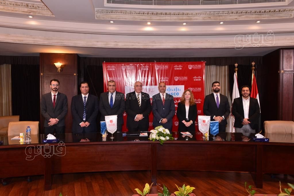 وقع البروتوكول عن جامعة المستقبل الدكتور عبادة سرحان رئيس جامعة المستقبل وعن الشركة المهندس أيمن الجوهري الرئيس التنفيذي لشركة سيسكو بمصر وشمال أفريقيا والمشرق العربي، وبحضور كل من المهندس أحمد فاروق المدير الإقليمي للمسؤولية المجتمعية وأكاديمية سيسكو بمصر والمشرق العربي والمهندس مصطفي سرور مدير المبيعات للقطاع الحكومي، والدكتور السيد تاج الدين عميد كلية الهندسة والتكنولوجيا بجامعة المستقبل، والدكتور محمود سامي بكلية الحاسبات وتكنولوجيا المعلومات ومدير مركز ضمان الجودة والتطوير المستمر بجامعة المستقبل.