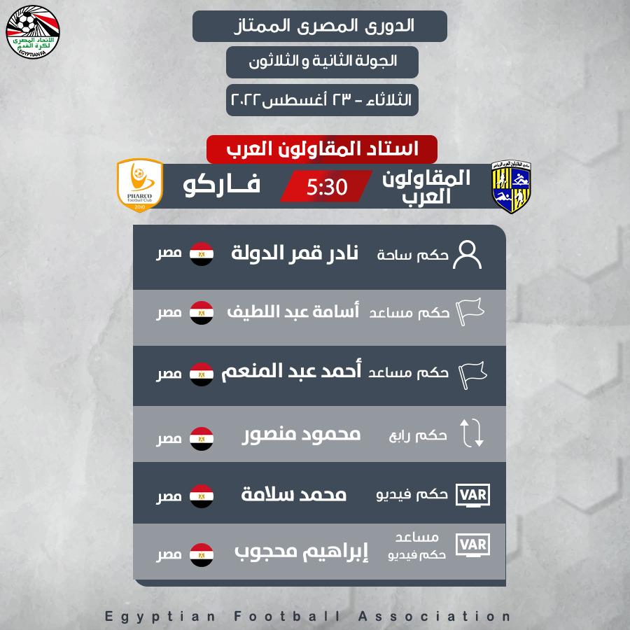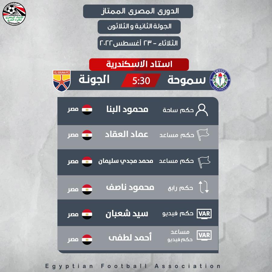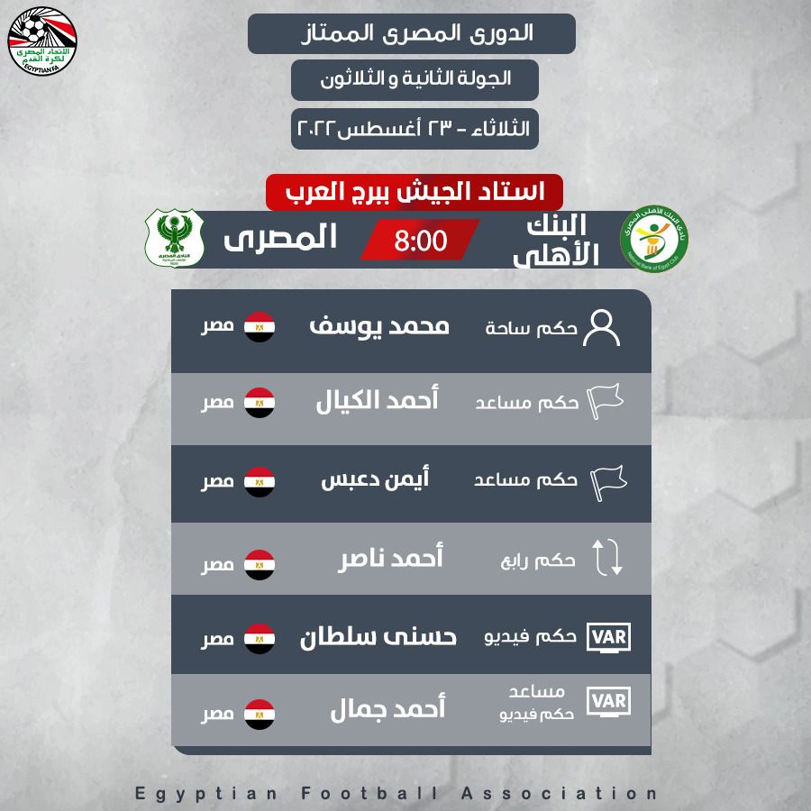 أعلنت لجنة الحكام الرئيسية باتحاد الكرة أسماء حكام مباريات اليوم الثلاثاء ضمن مواجهات الجولة 32 من مسابقة الدورى الممتاز على النحو التالي: