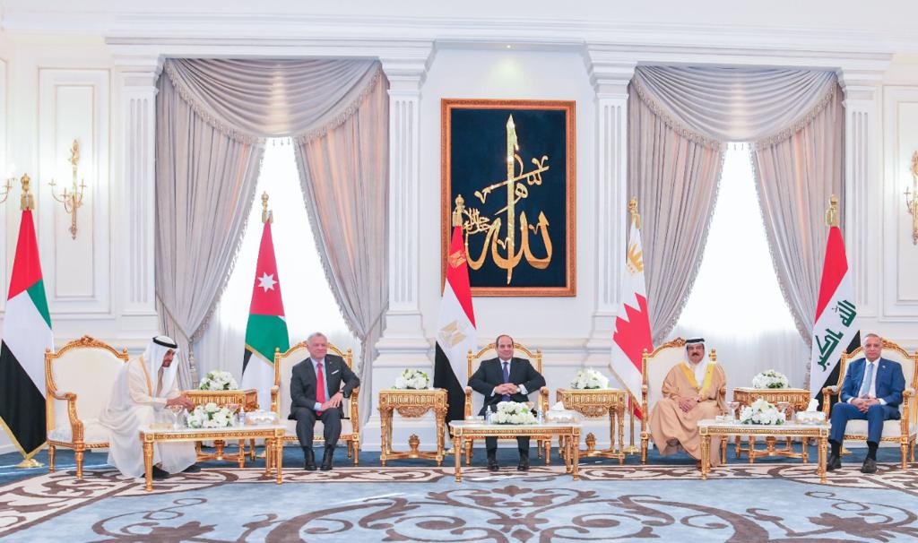 استقبل الرئيس عبد الفتاح السيسي بمطار العلمين بحضور الشيخ محمد بن زايد آل نهيان رئيس الامارات كلًا من جلالة الملك عبد الله الثاني بن الحسين، ملك الأردن، وجلالة الملك حمد بن عيسى آل خليفة، ملك البحرين، ومصطفى الكاظمي، رئيس الوزراء العراقي".