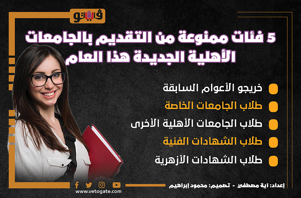 5 فئات ممنوعة من التقديم بالجامعات الأهلية الجديدة هذا العام | إنفوجراف الثلاثاء 23/أغسطس/2022 - 06:13 م 8/23/2022 6:13:15 PM الجامعات الاهلية آية مصطفى شارك طباعة 18 حجم الخط شارك طباعة الجامعات الأهلية الجامعات الخاصة التقديم للجامعات الاهلية الشهادات الازهرية الشهادات الفنية انفوجراف