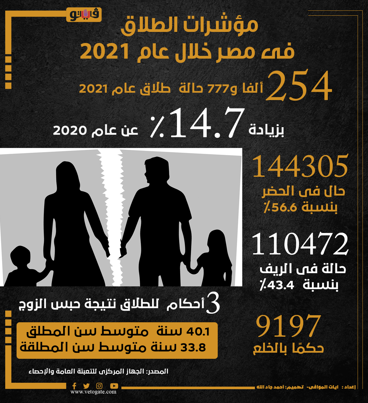 مؤشرات الطلاق فى مصر خلال عام 2021| إنفوجراف الأربعاء 24/أغسطس/2022 - 03:20 م 8/24/2022 3:20:43 PM الجهاز المركزي للتعبئة العامة والاحصاء آيات الموافى شارك طباعة 18 حجم الخط شارك طباعة طلاق حالات الطلاق اشهادات الطـــــــــلاق