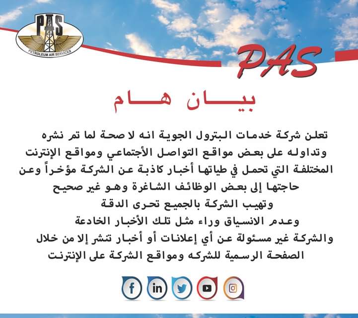 اكدت شركة خدمات البترول الجوية عدم احتياجها أو إأعلانها عن وجود وظائف خلال الفترة الحالية مشيرة إلى أنه تم استغلال اسم الشركة في الاعلان عن وظائف وهمية.