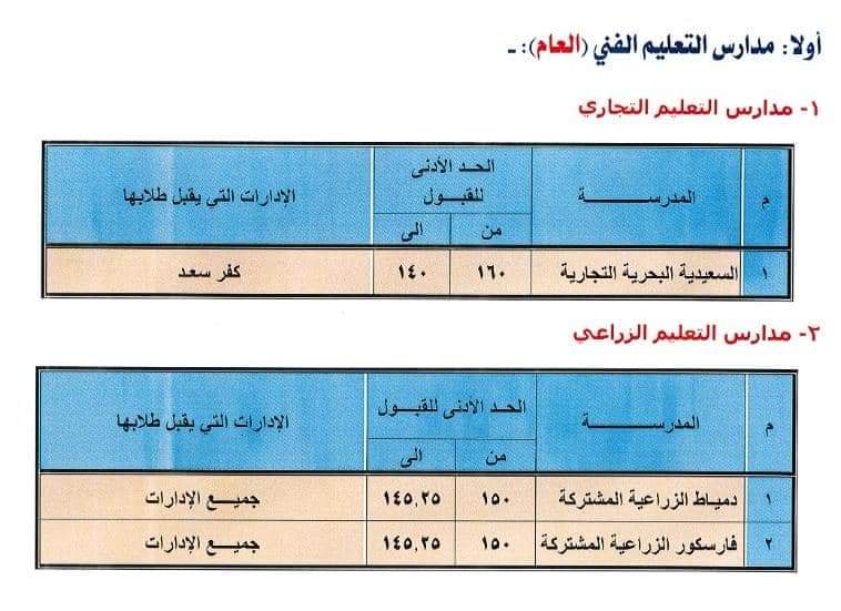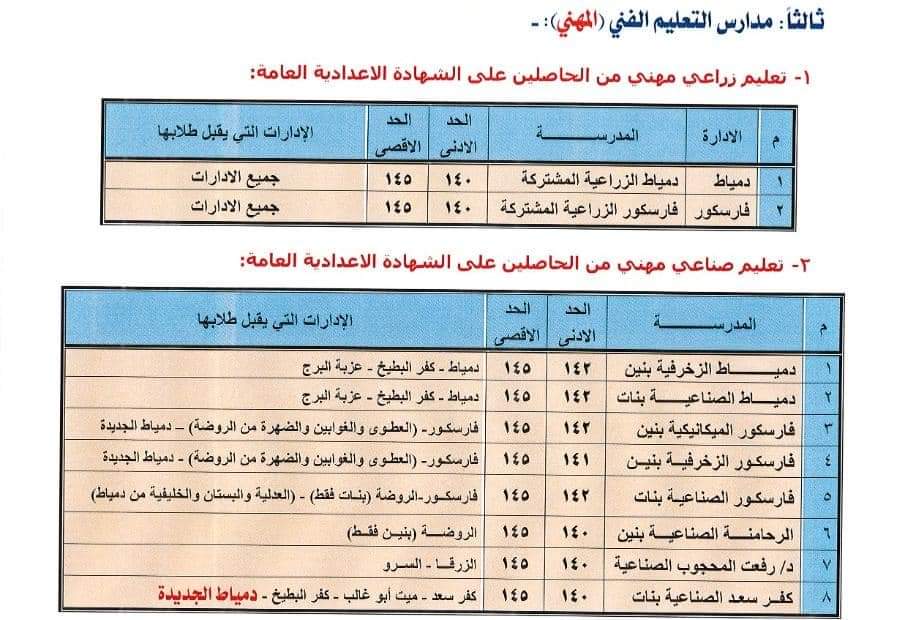 أشار الدكتور خالد خلف مدير مديرية التربية والتعليم أنه تم تعديل تنسيق القبول وذلك بعد اعتماد نتيجة الدور الثاني للشهادة الإعدادية حتى يتمكن الطلاب الحاصلين على مجموع ١٤٠ حتى ١٥٠ درجة من الالتحاق بمدارس المرحلة الثانوية للتعليم الفنى..