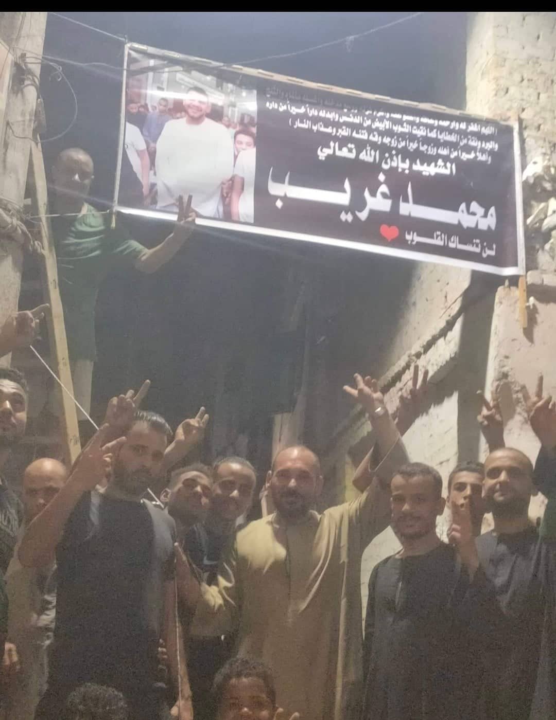 علق أهالى جرجا لافتة لــ شاب دفع حياته في محاولة إنقاذ 9 من جيرانه فى حريق بشقة بمدينة جرجا بسوهاج بعنوان وكلمات الشهيد بإذن الله تعالى محمد غريب... لن تنساك القلوب.
