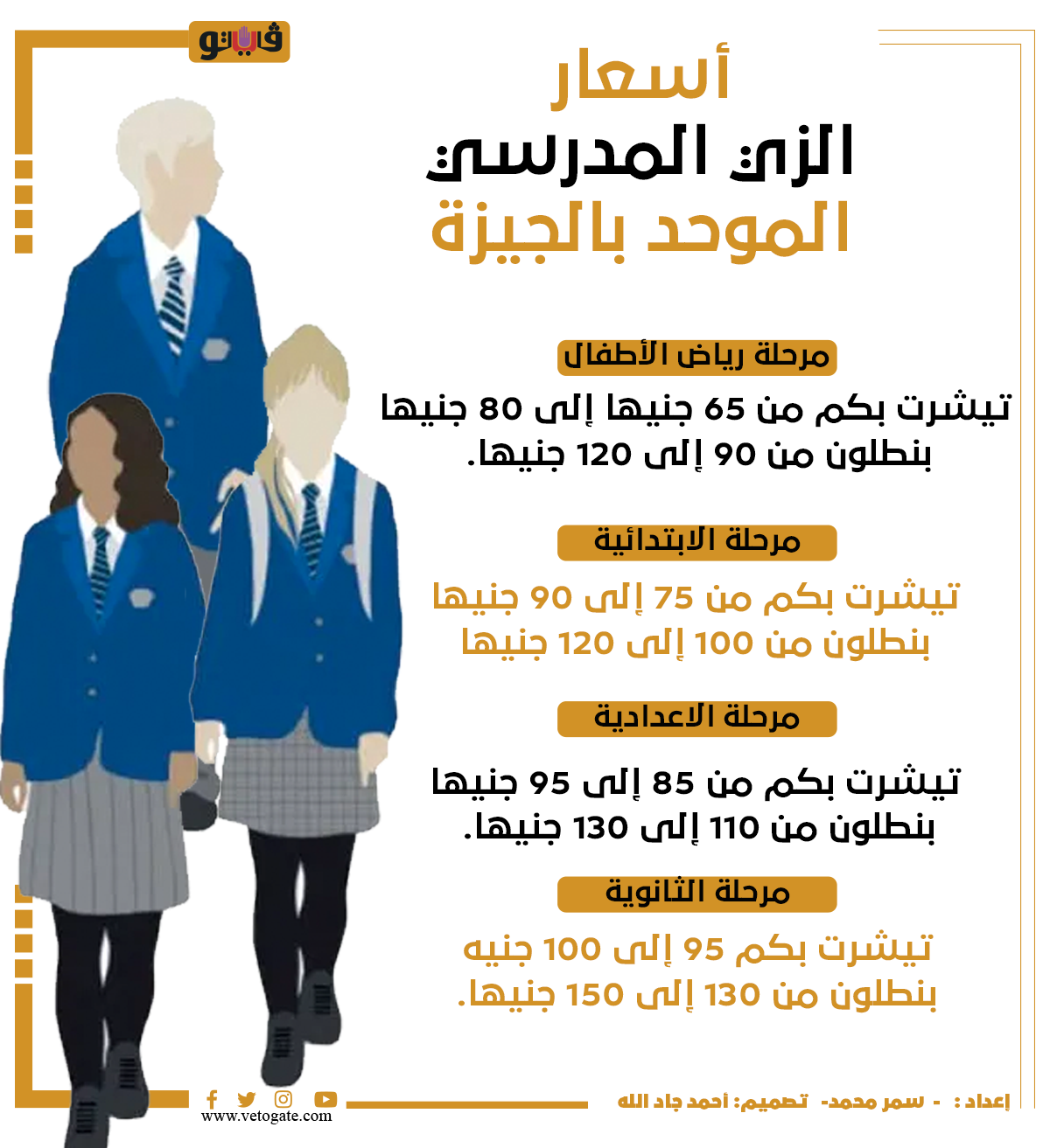 أسعار الزي المدرسي الموحد بالجيزة| انفوجراف الأربعاء 24/أغسطس/2022 - 12:29 م 8/24/2022 12:29:58 PM الزي المدرسي الموحد سمر محمد شارك طباعة 18 حجم الخط شارك طباعة الصف الاول الابتدائي مرحلة رياض الأطفال الزي المدرسي اسعار الزي المدرسي الموحد