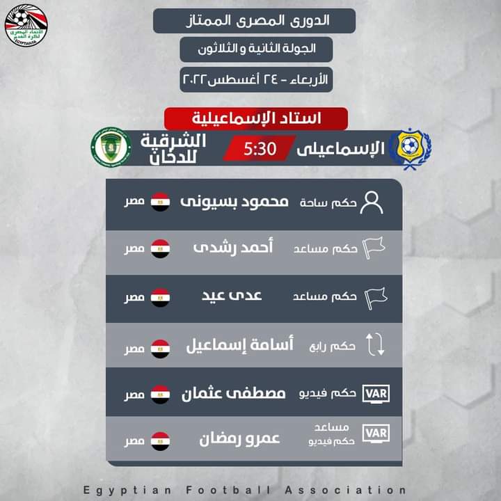 أعلنت لجنة الحكام الرئيسية باتحاد الكرة أسماء حكام مباراتي اليوم الأربعاء ضمن مواجهات الجولة 32 من مسابقة الدورى الممتاز على النحو التالي: