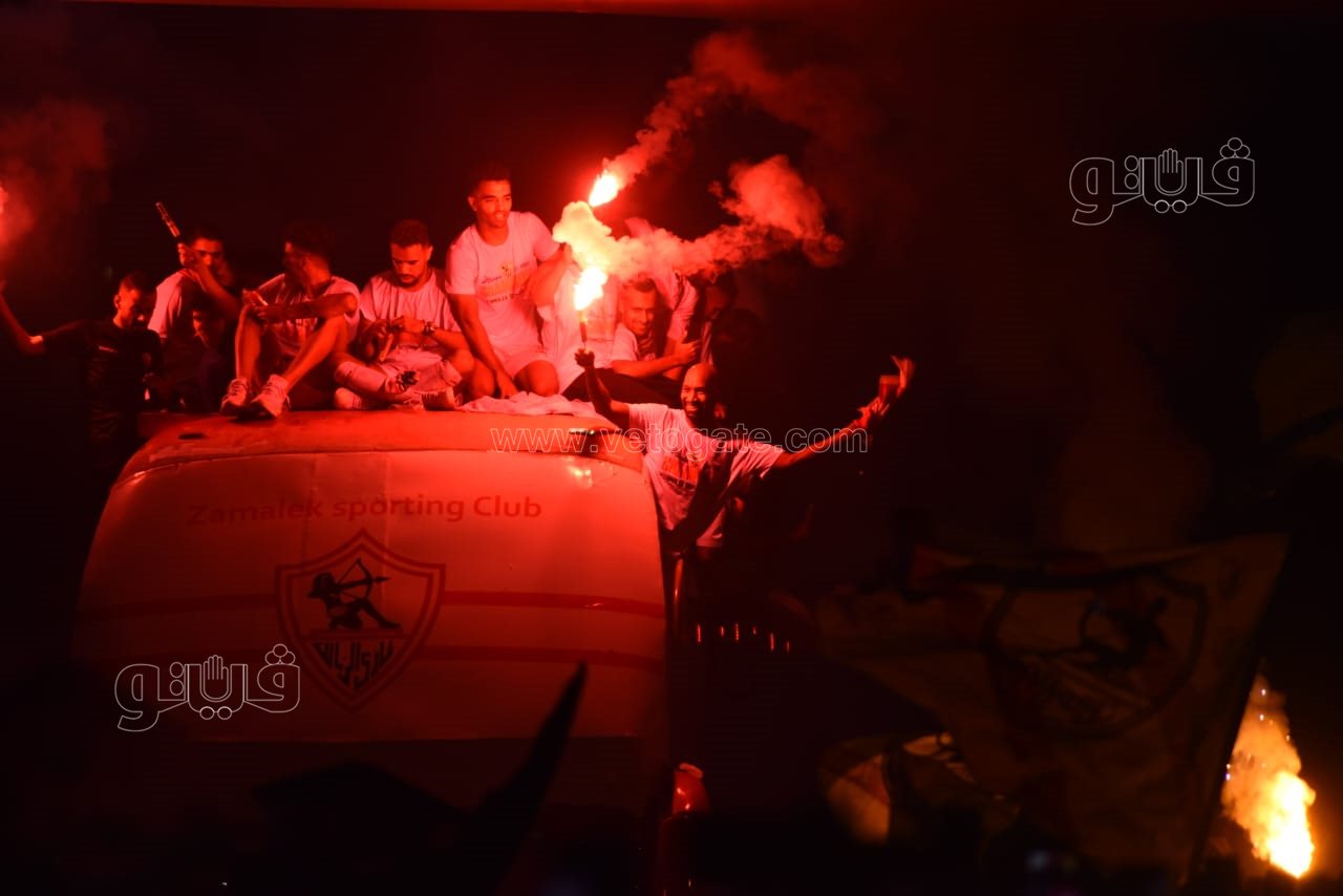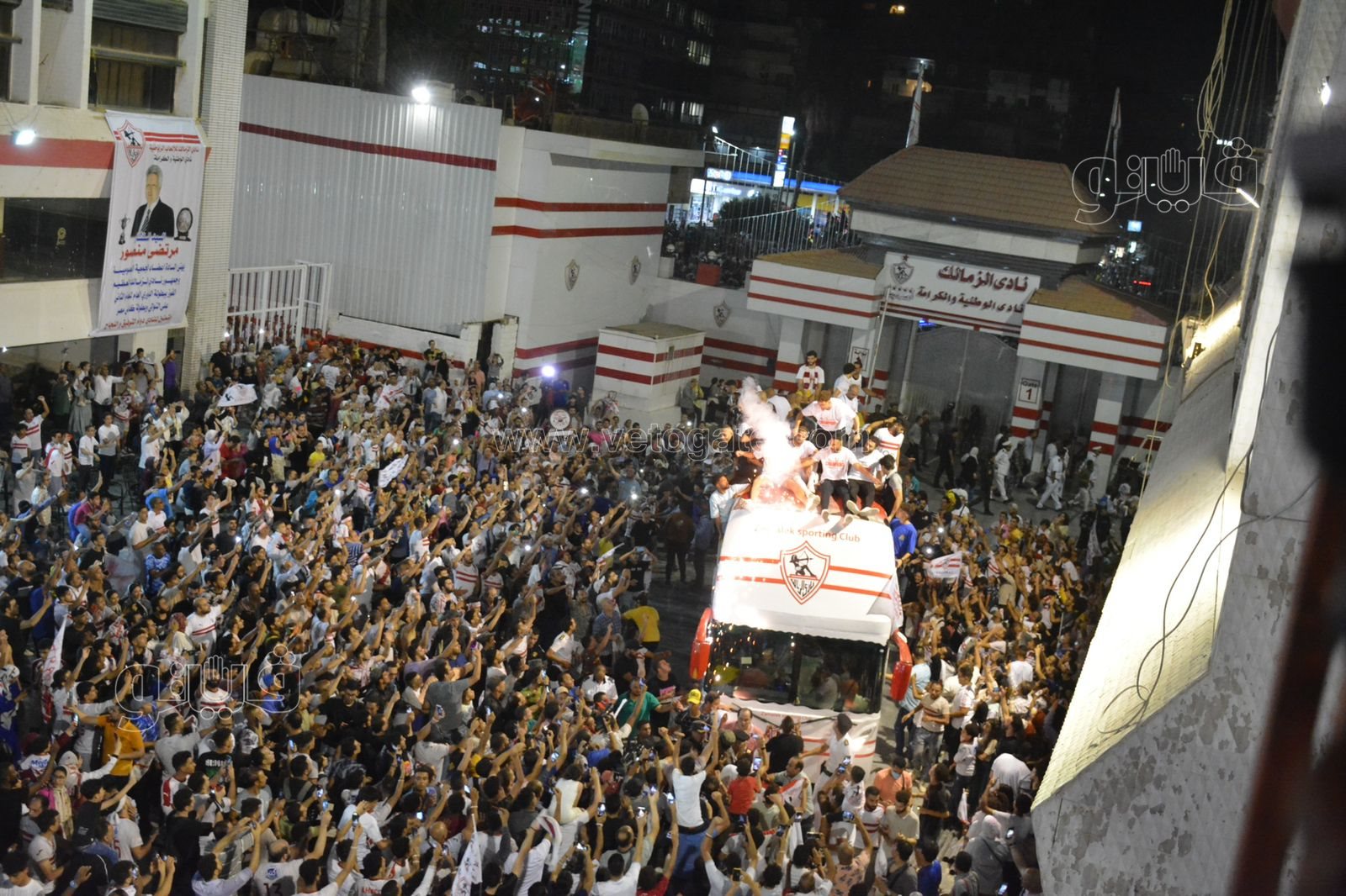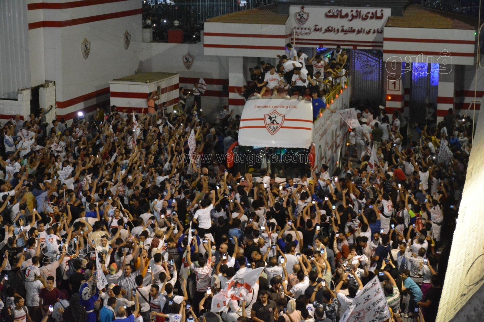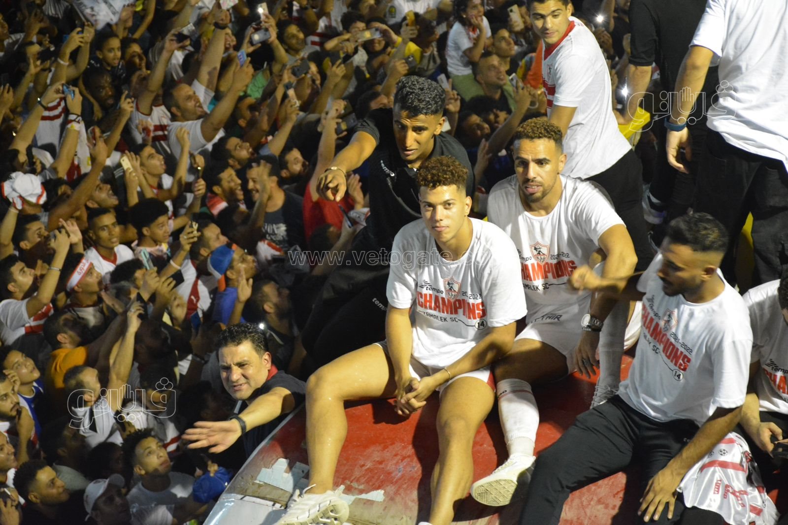 احتفل لاعبو نادي الزمالك مع الجماهير أمام وداخل القلعة البيضاء بميت عقبة بالتتويج بدرع الدوري المصري الممتاز، بالأغاني والهتافات، وسط إطلاق الألعاب النارية والشماريخ من أعلى أتوبيس الفريق.