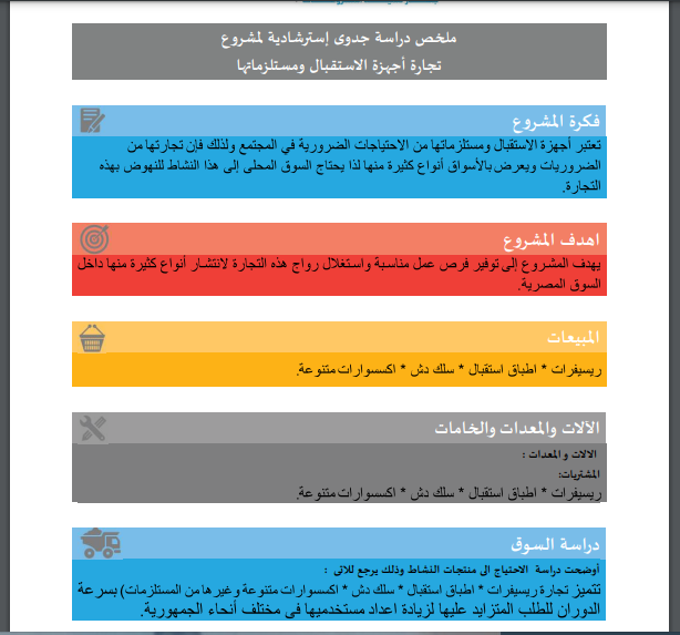 وتستعرض "فيتو" كافة التفاصيل المتعلقة بملخص دراسة جدوى استرشادية لمشروع تجارة أجهزة استقبال ومستلزماتها، والتي أعدها جهاز تنمية المشروعات الصغيرة والمتوسطة خلال السطور التالية: