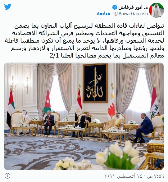 قال المستشار الدبلوماسي للرئيس الإماراتي، أنور قرقاش، اليوم الأربعاء، إن لقاءات قادة منطقة الشرق الأوسط هدفها ترسيخ آليات التعاون بما يضمن التنسيق ومواجهة التحديات وتعظيم فرص الشراكة الاقتصادية لخدمة الشعوب.