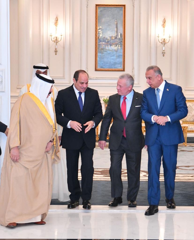 شهدت الـ48 ساعة الماضية نشاط رئاسي مكثف بمدينة العلمين حيث استقبل الرئيس عبد الفتاح السيسي بمطار العلمين بحضور الشيخ محمد بن زايد آل نهيان رئيس الإمارات كلًا من جلالة الملك عبد الله الثاني بن الحسين، ملك الأردن، وجلالة الملك حمد بن عيسى آل خليفة، ملك البحرين، ومصطفى الكاظمي، رئيس الوزراء العراقي".