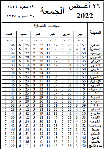 مواقيت الصلاة اليوم وفقًا للتوقيت المحلي لمدينتي القاهرة والإسكندرية وعدد من مدن ومحافظات الجمهورية من واقع بيانات الهيئة العامة للمساحة: