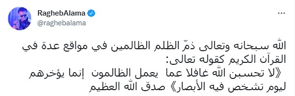 وعاد الفنان راغب علامة وكتب عبر حسابه بموقع التواصل الاجتماعي "تويتر" وقال في تغريدته: "الله سبحانه وتعالى ذمّ الظلم الظالمين في مواقع عدة في القرآن الكريم كقوله تعالى: "لا تحسبن الله غافلا عما يعمل الظالمون إنما يؤخرهم ليوم تشخص فيه الأبصار" صدق الله العظيم"